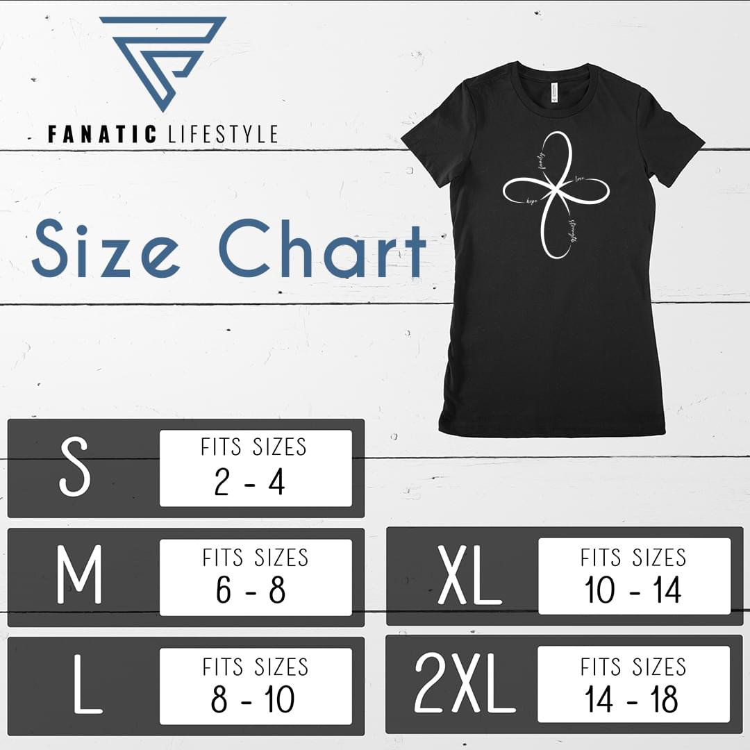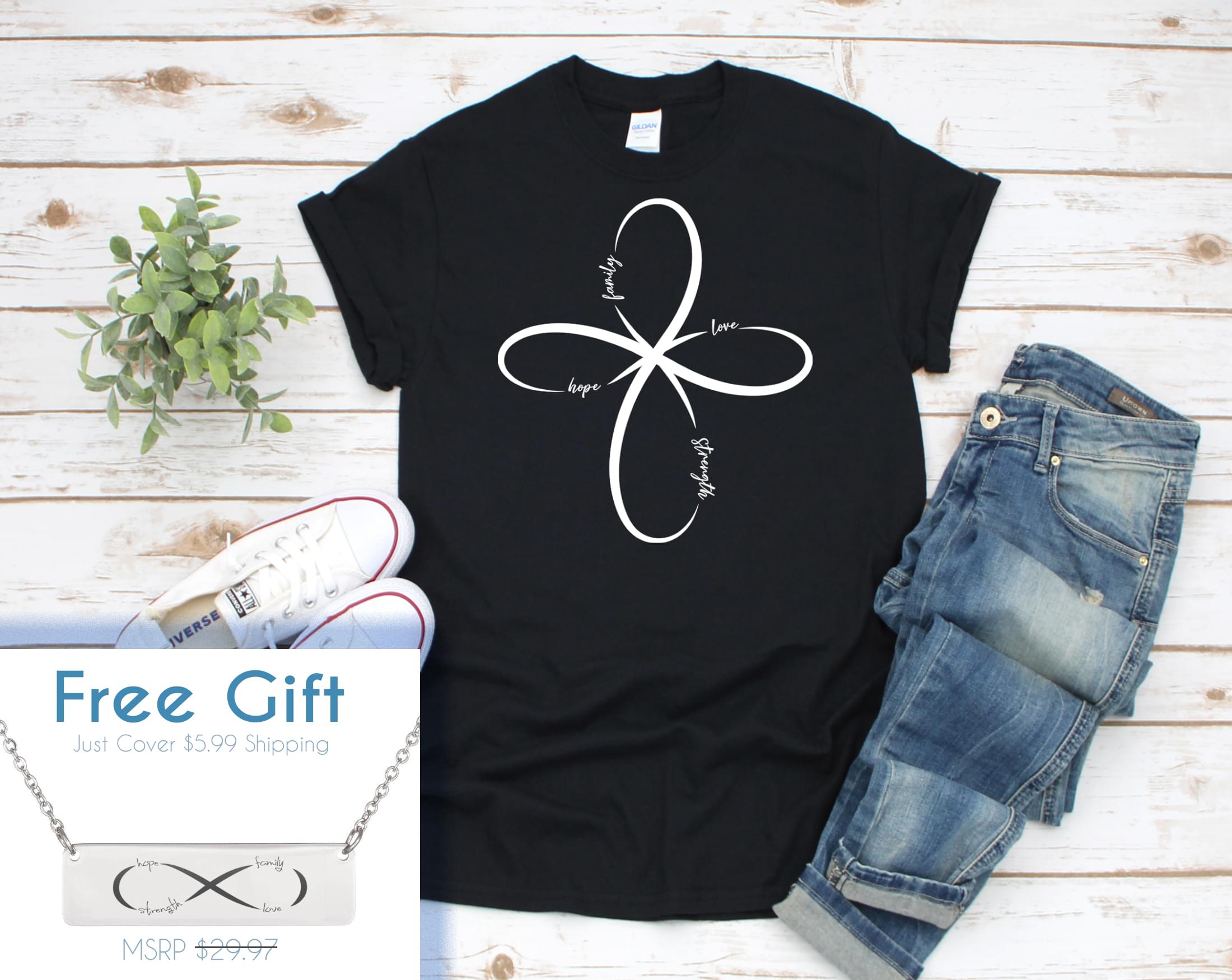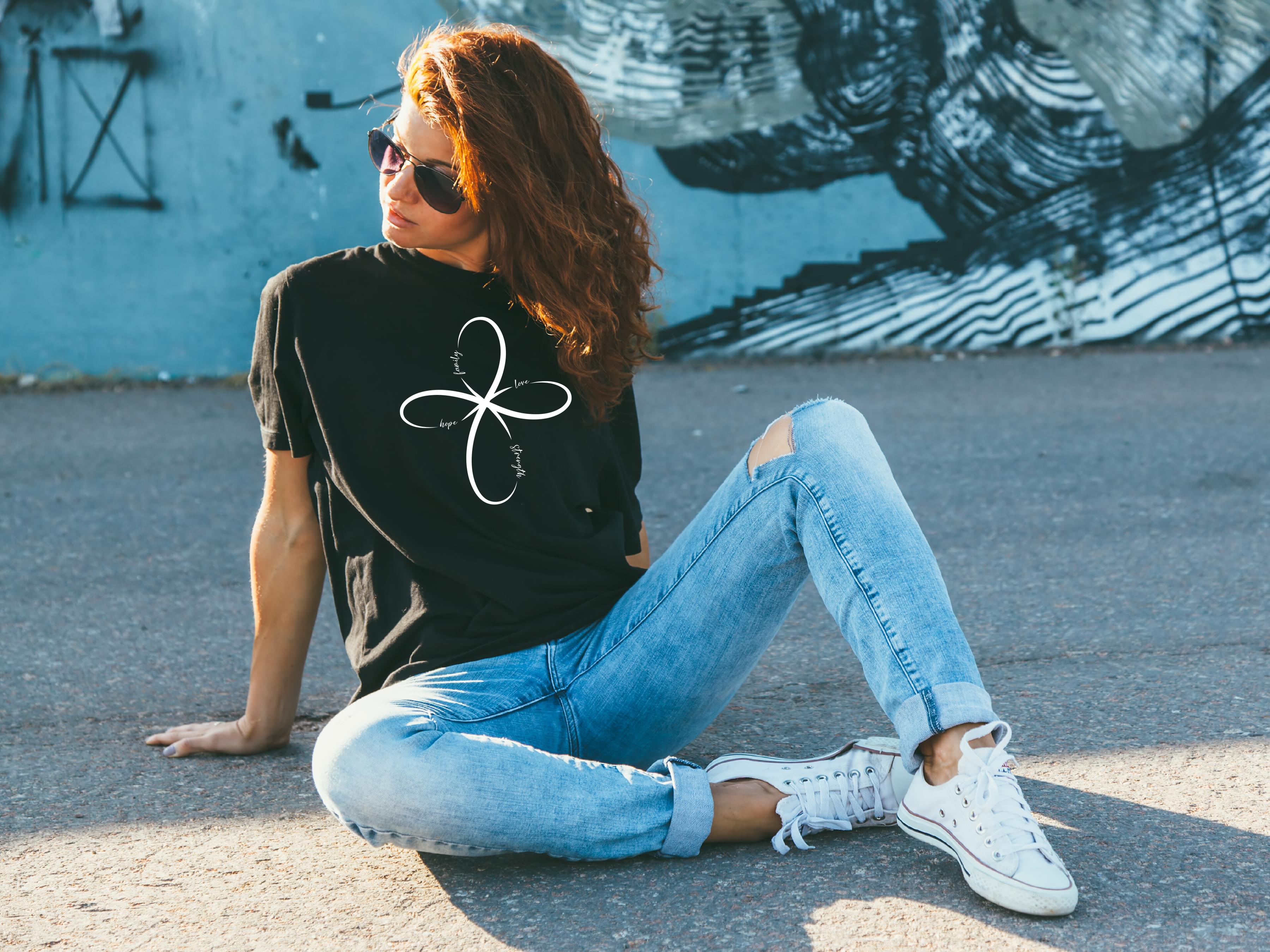 There's no need to fuss, pull or tug through your day when you wear our longer length “NO TUG TEE” that sits still and stays put, even while you wiggle or walk. Express your Faith with our LOVE-FAMILY-HOPE- & STRENGTH design on this super comfortable shirt without the creep up that you’ll find with most other apparel brands! The Extra length prevents overexposure because Tug-free is the way to be!